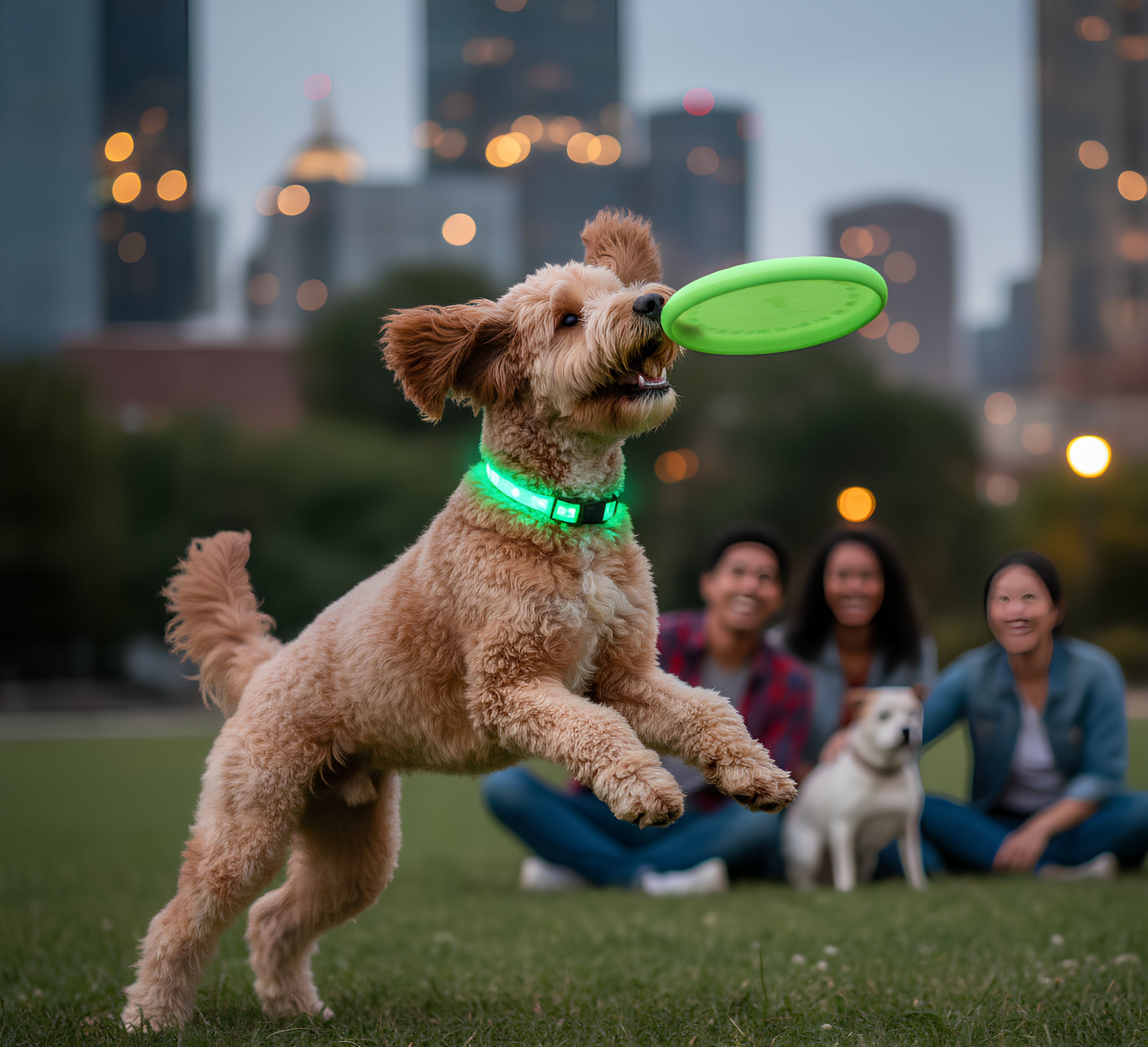 Keep the good times glowing! Our LED collars ensure your dog is safe and seen during every exciting game, from dusk 'til dawn. Perfect for park play! -