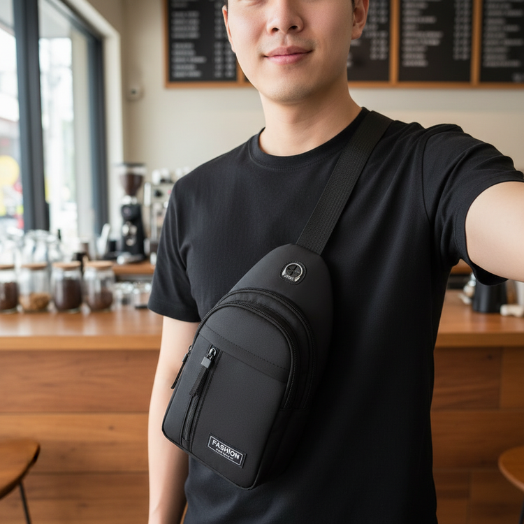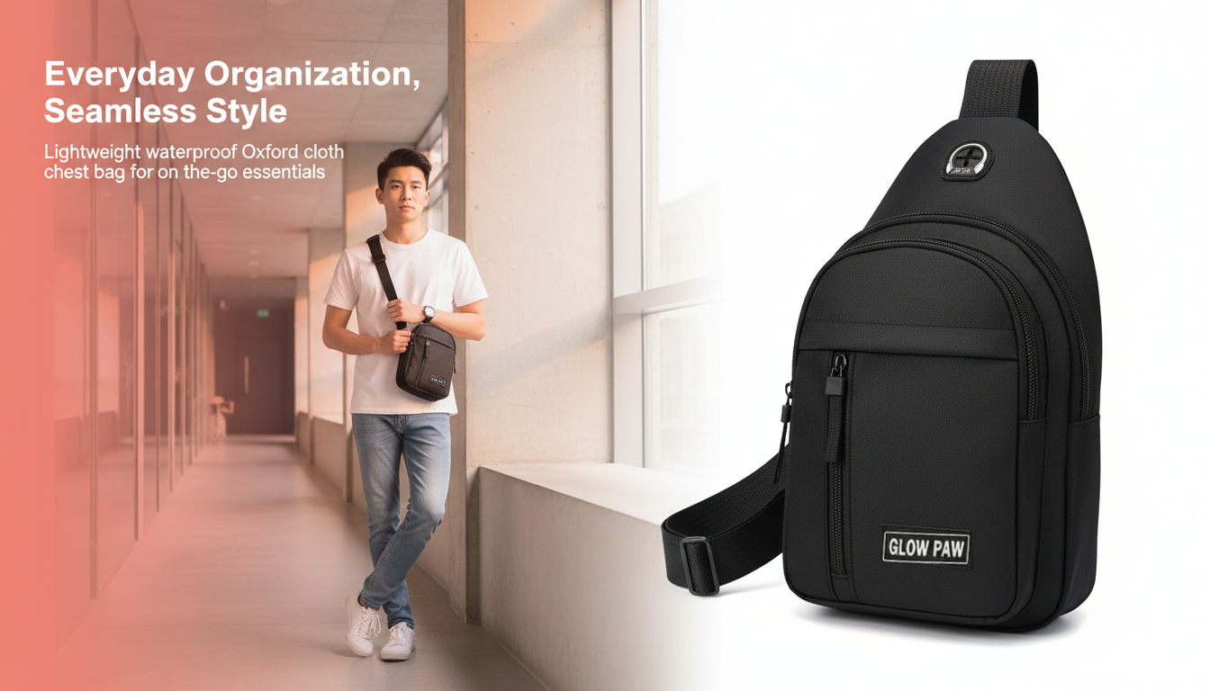 Crafted from high-density Oxford cloth with a waterproof coating, this chest bag features a spacious main compartment for your phone, tablet, and power bank. Front zippered pocket and inner mesh pouches keep your wallet, keys, cards, and cables neatly organized. Adjustable quick-release strap and corrosion-resistant hardware ensure durability and comfort for all-day wear.